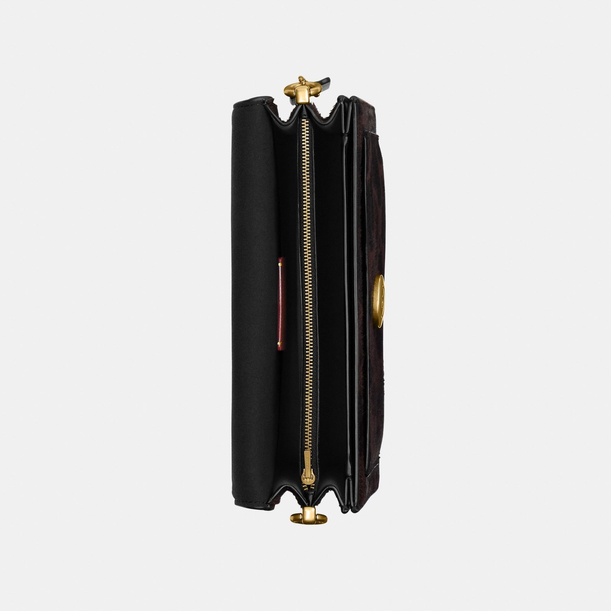 جلد عجل فاخر مع شعر العجل المطبوع جيوب داخلية بسحّاب ومتعددة الاستخدامات إغلاق بزر كبس مع بطانة قماشية جيب خارجي مفتوح حزام قصير قابل للفصل بطول 19.5 سم حزام طويل قابل للفصل بطول 54.5 سم للارتداء على الكتف أو بأسلوب كروس بودي 26 سم (الطول) × 14 سم (الارتفاع) × 7 سم (العرض)