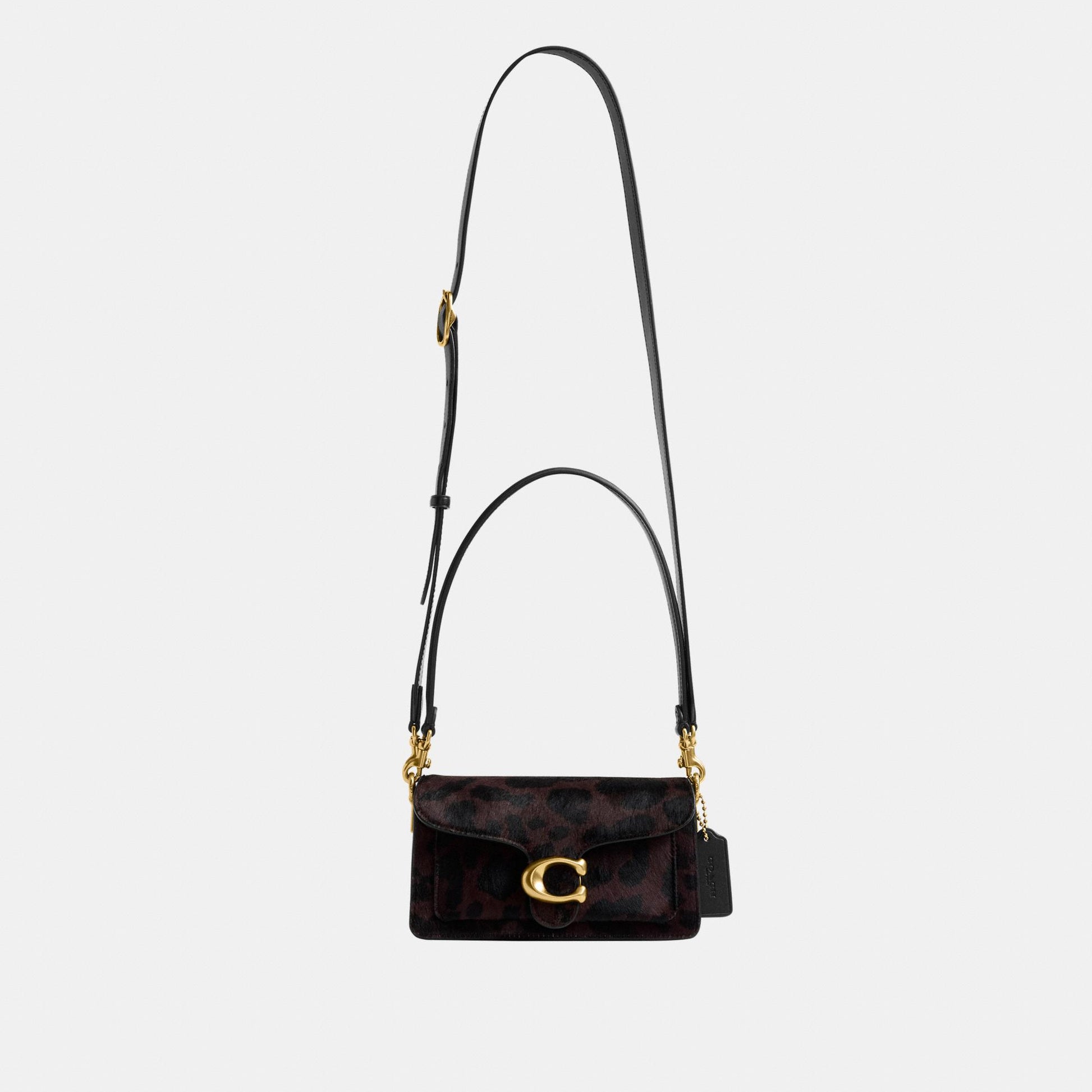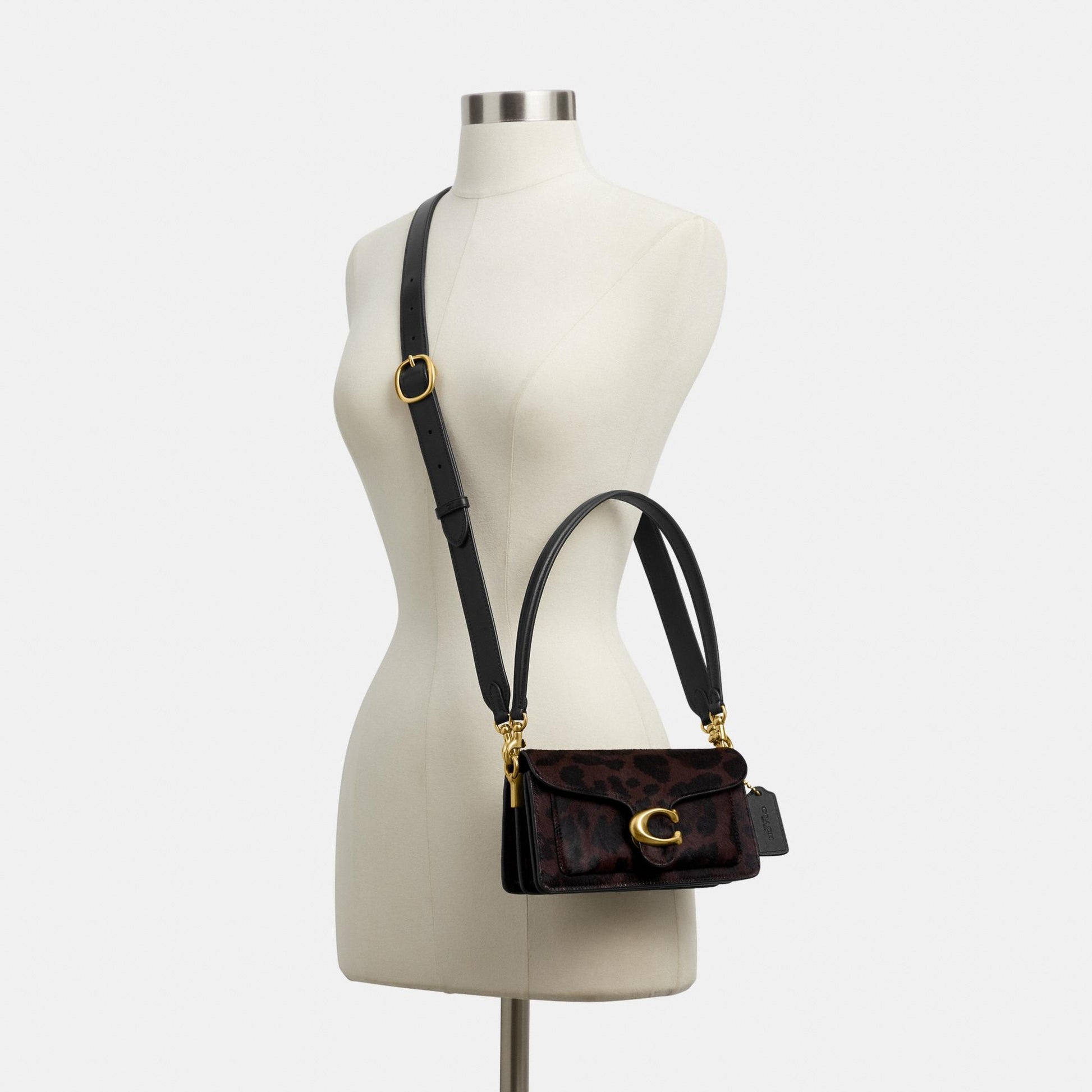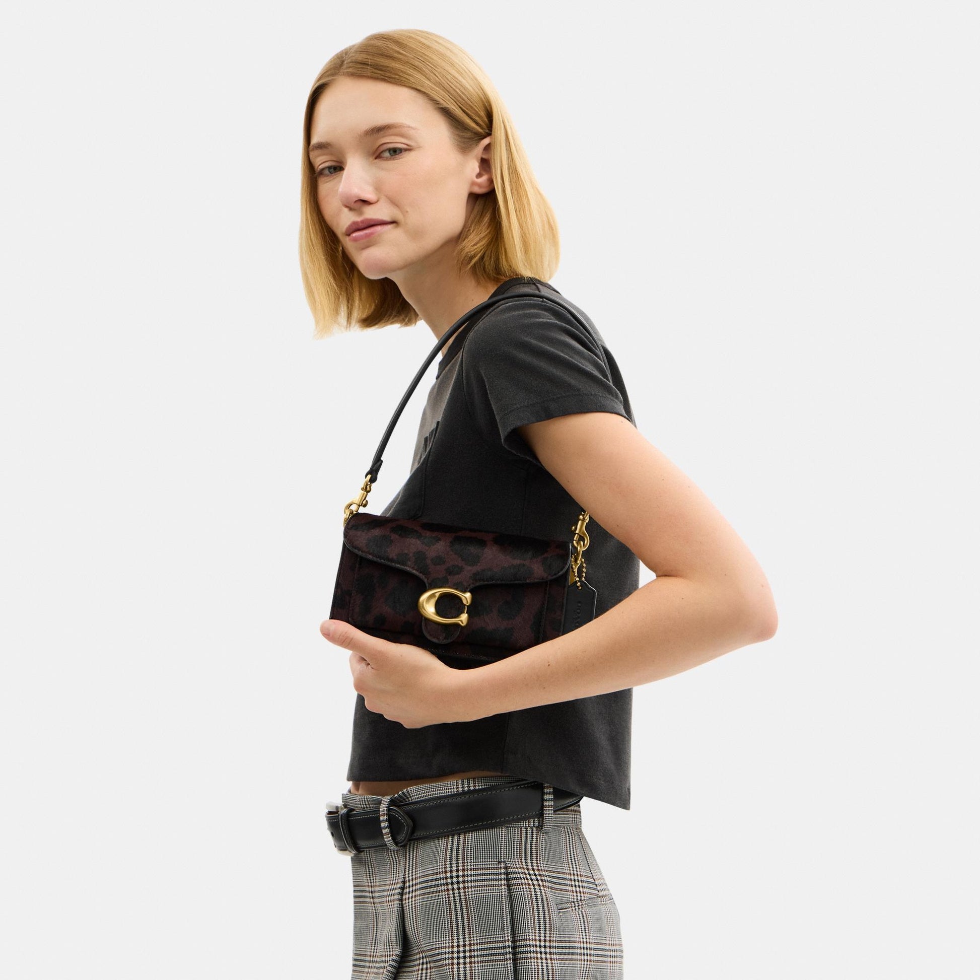 بلمسة عصرية مستوحاة من تصميم أرشيفي لكوتش يعود إلى سبعينيات القرن الماضي، تأتي حقيبة الكتف "تابي" بتصميم هيكلي أنيق مصنوع من جلد فاخر مع شعر مطبوع بنقشة فهد جريئة. النسخة الصغيرة 20، الأصغر من حجم 26، تتميّز بحزامين قابلين للفصل، ما يتيح حملها باليد، ارتداؤها كحقيبة كتف قصيرة، أو بأسلوب كروس بودي. ويكتمل التصميم بإكسسوار الماركة الأيقوني كلمسة أيقونية مميّزة.