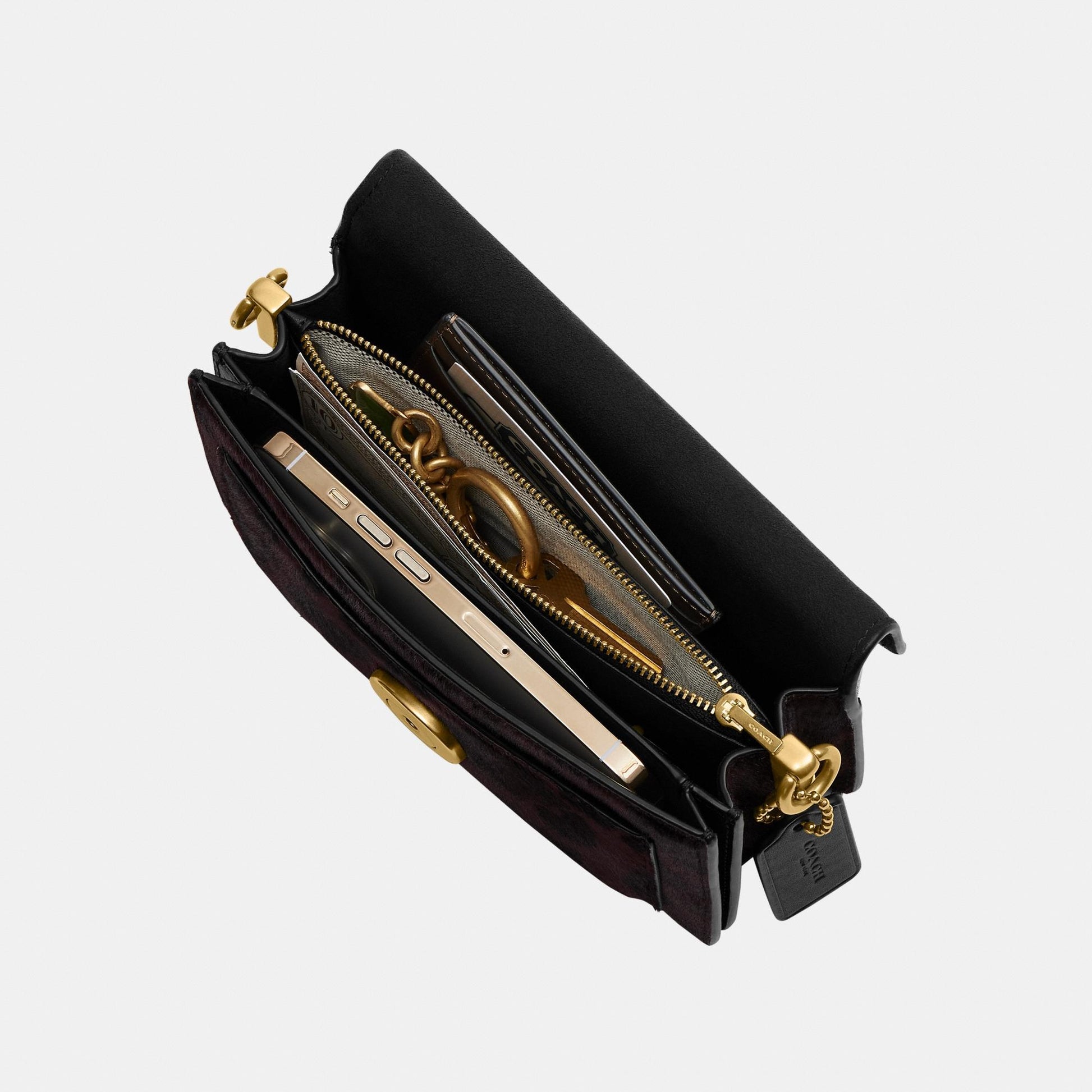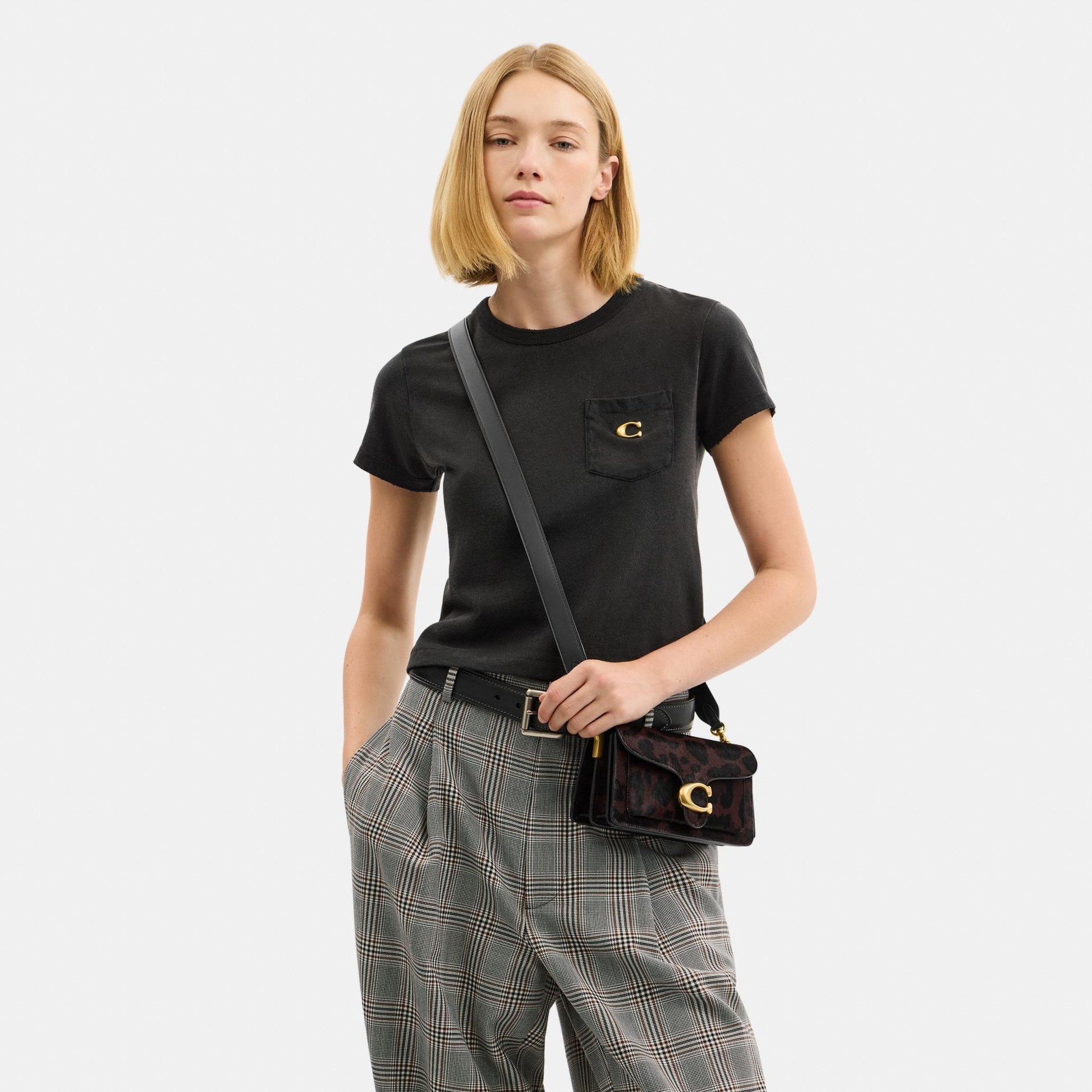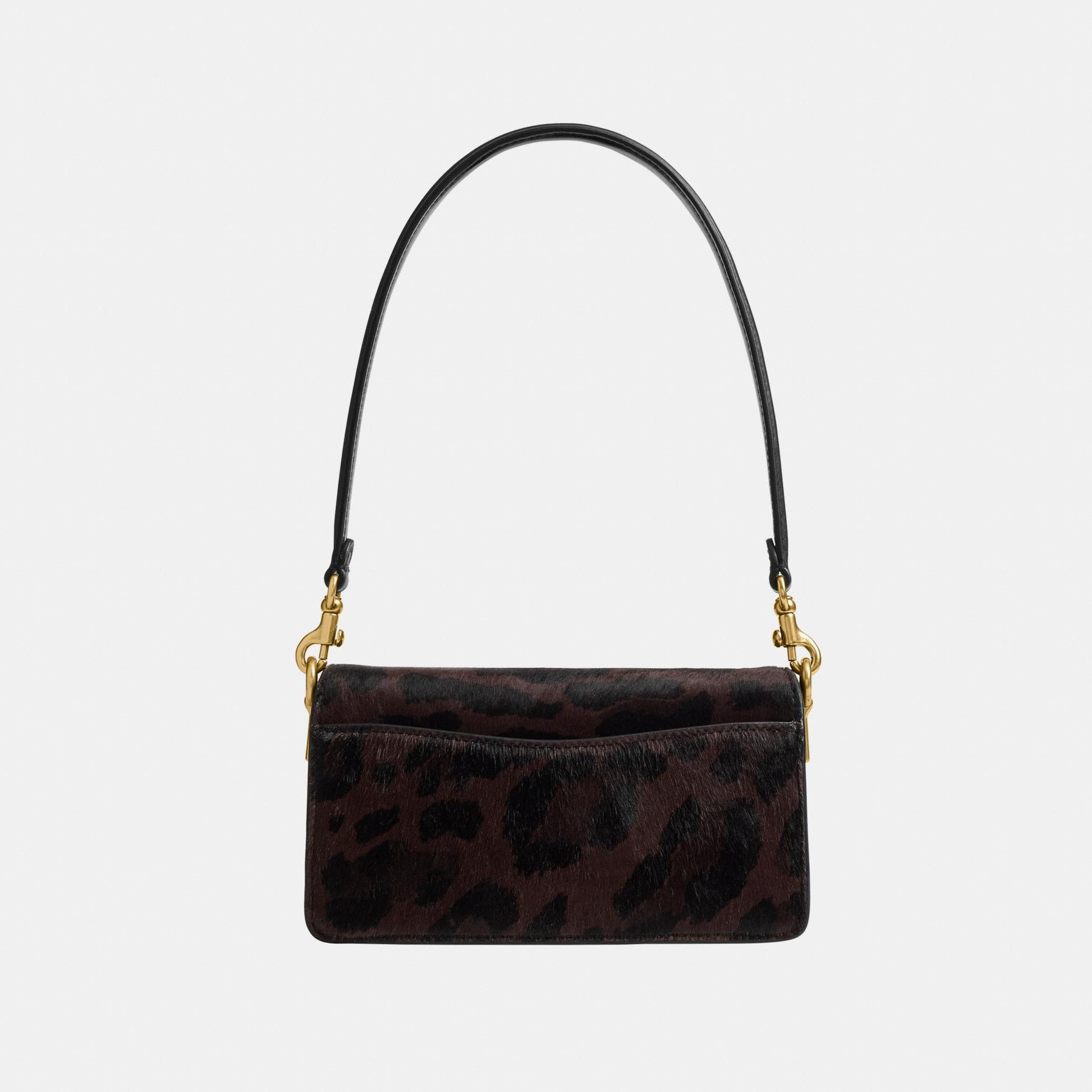 بلمسة عصرية مستوحاة من تصميم أرشيفي لكوتش يعود إلى سبعينيات القرن الماضي، تأتي حقيبة الكتف "تابي" بتصميم هيكلي أنيق مصنوع من جلد فاخر مع شعر مطبوع بنقشة فهد جريئة. النسخة الصغيرة 20، الأصغر من حجم 26، تتميّز بحزامين قابلين للفصل، ما يتيح حملها باليد، ارتداؤها كحقيبة كتف قصيرة، أو بأسلوب كروس بودي. ويكتمل التصميم بإكسسوار الماركة الأيقوني كلمسة أيقونية مميّزة.