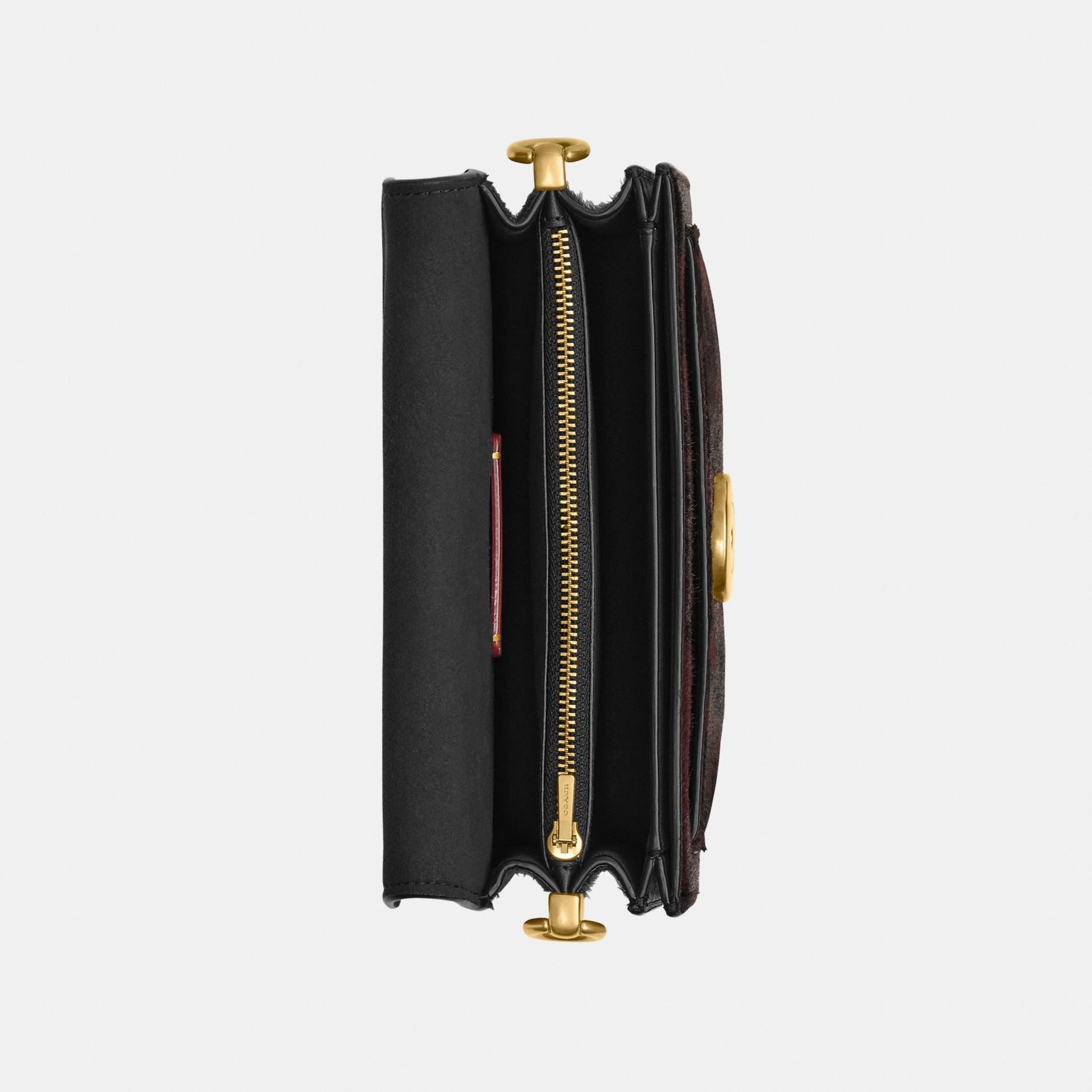 جلد عجل فاخر مع شعر العجل المطبوع جيوب داخلية بسحّاب ومتعددة الاستخدامات إغلاق بزر كبس مع بطانة جلدية مقبض قابل للفصل بطول 21.5 سم جيب خارجي مفتوح حزام قابل للفصل بطول 54.5 سم للارتداء على الكتف أو بأسلوب كروس بودي 20 سم (الطول) × 11 سم (الارتفاع) × 7 سم (العرض)