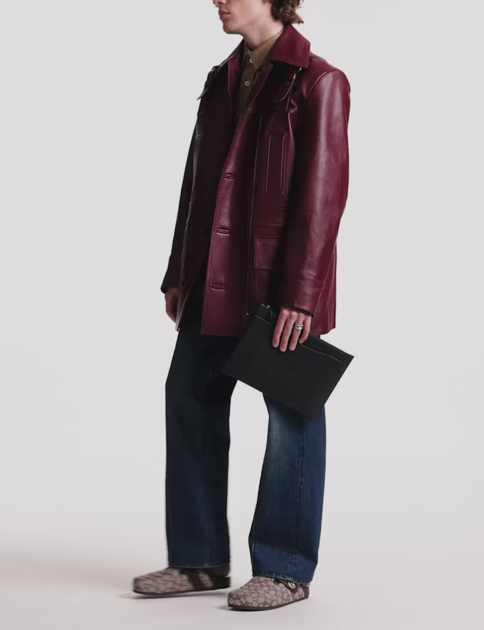 مزيج مثالي من التصميم العصري البسيط والأناقة المتقنة، تم صنع محفظة المعصم من الجلد الحُبيبي المقاوم للخدش. توفر مساحة لحفظ جهاز آيباد ميني وجيوب خارجية لسهولة التنظيم. يزدان شكلها النهائي باكسسوار بتصميم شعار ماركة كوتش وبطانة من القماش بنقشة ماركة كوتش. يتيح لك حزام المعصم امكانية حملها بمفردها، أو استخدمها للحفاظ على مقتنياتك الصغيرة منظمة في حقيبة الظهر أو حقيبة اليد.