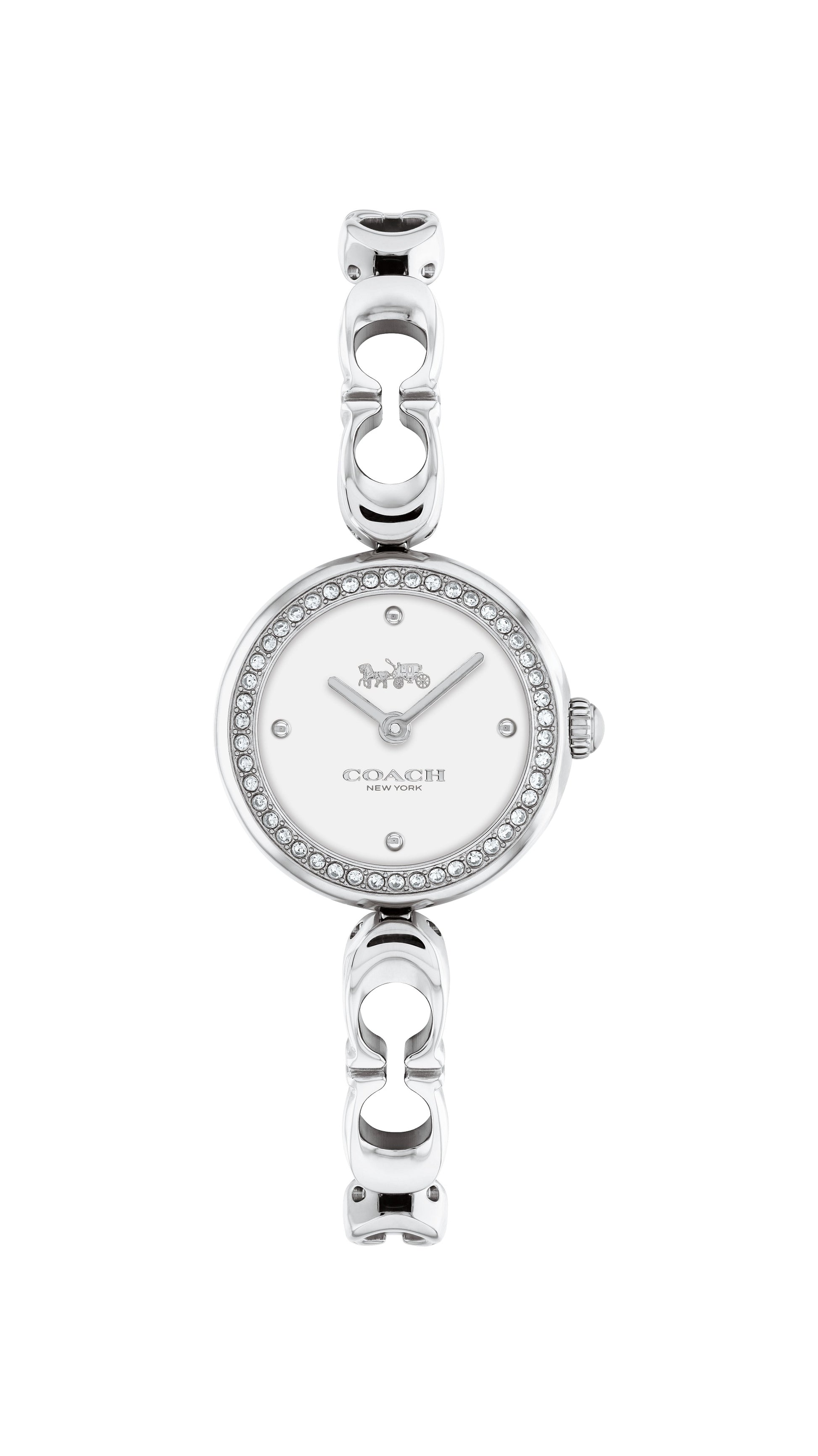 A small style with major attitude, Gracie adds a touch of elegance to your everyday. Shimmering with crystals, the stainless steel timepiece features a slender bangle bracelet detailed with the Coach Signature and a powder white dial finished with the iconic Coach Horse and Carriage motif for a heritage touch.