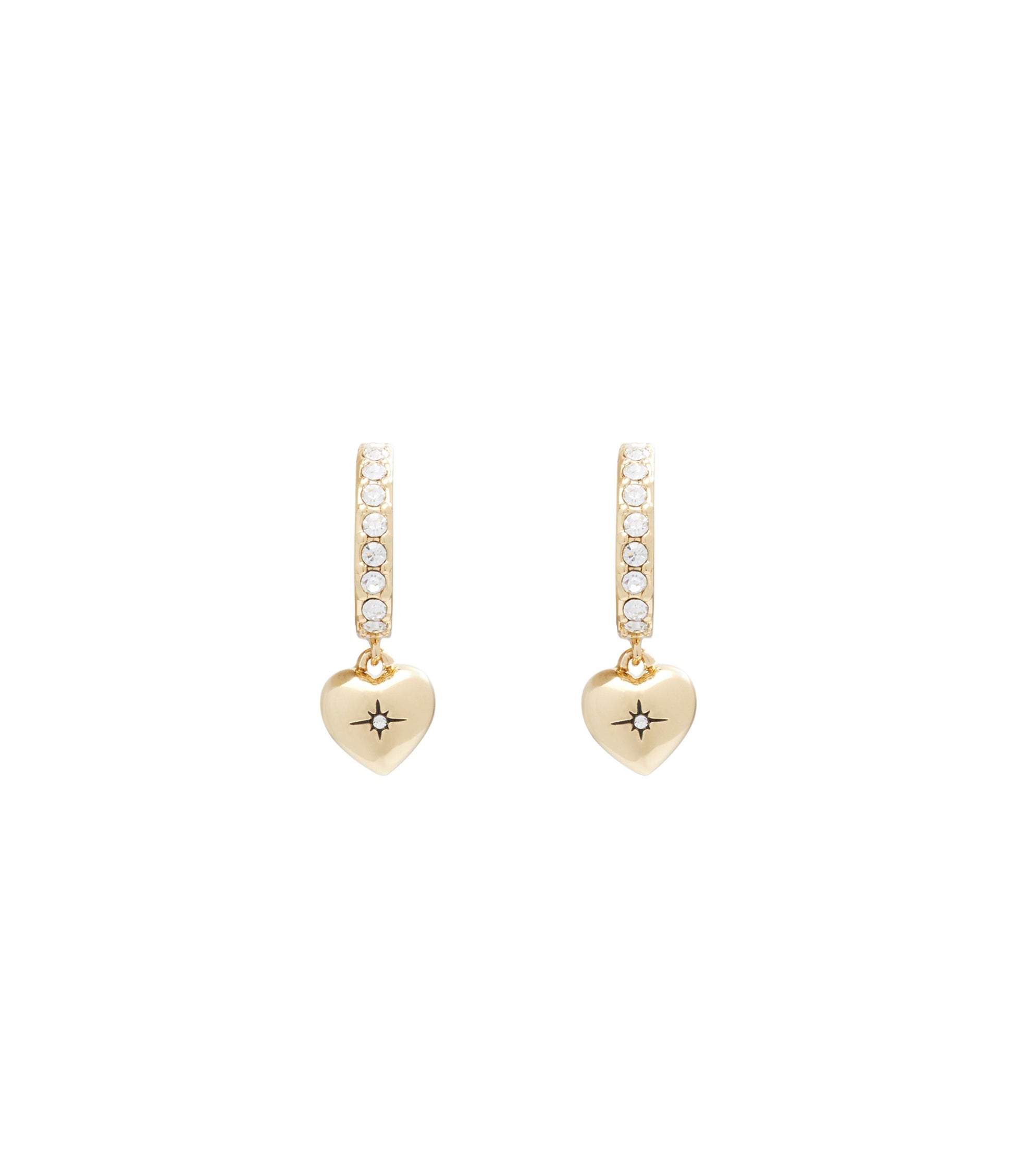 Glistening crystal tennis huggies with dangling iconic heart charm perfect for everyday. Earrings have a post back closure. Made from brass and glass crystal. Includes COACH pouch.